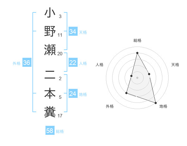 小野瀬 二本糞さんを姓名の画数から五運を鑑定
