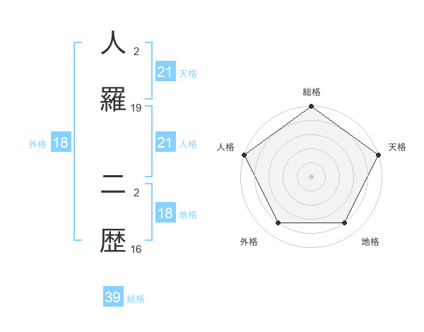 人羅 二歴さんを姓名の画数から五運を鑑定