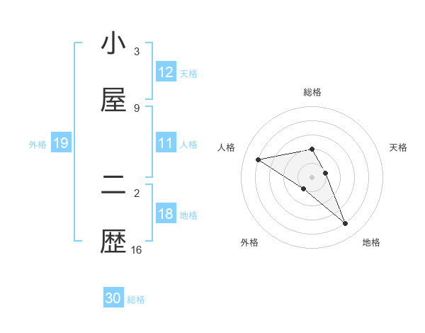 小屋 二歴さんの総格は30画の2点!