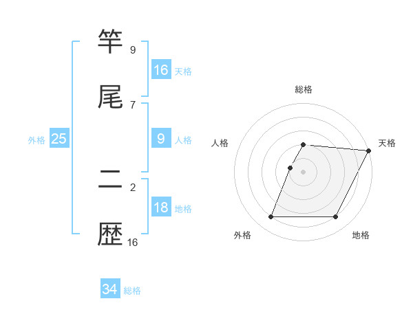 竿尾 二歴さんの天格は16画の5点!