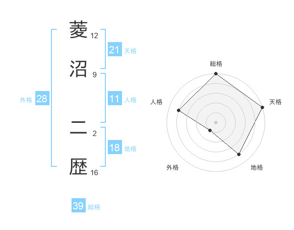菱沼 二歴さんの天格は21画の5点!