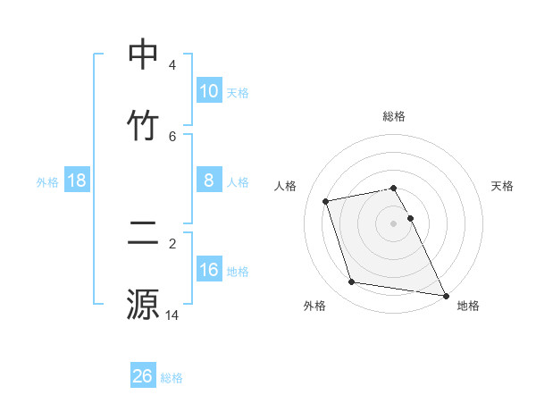 中竹 二源さんの総格は26画の2点!