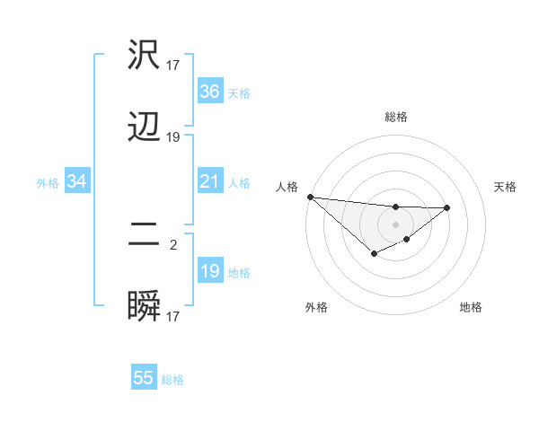 沢辺 二瞬さんの総格は55画の1点!