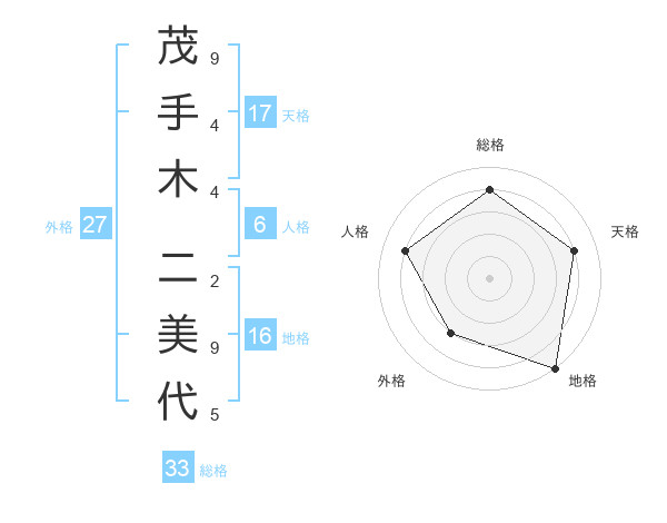 茂手木 二美代さんの総格は33画の4点!