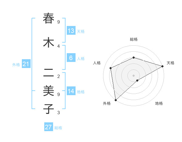 占い結果は姓名判断である以上、良い場合も悪い場合もありますが、決してお名前を誹謗中傷するものでなく、画数の自動計算によって得られたものです。また、本サイトの検索によって得られた鑑定結果で、第三者を誹謗中傷したり名誉を棄損するような行為を禁じます。