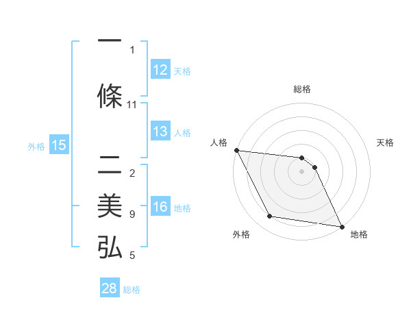 一條 二美弘さんを姓名の画数から五運を鑑定