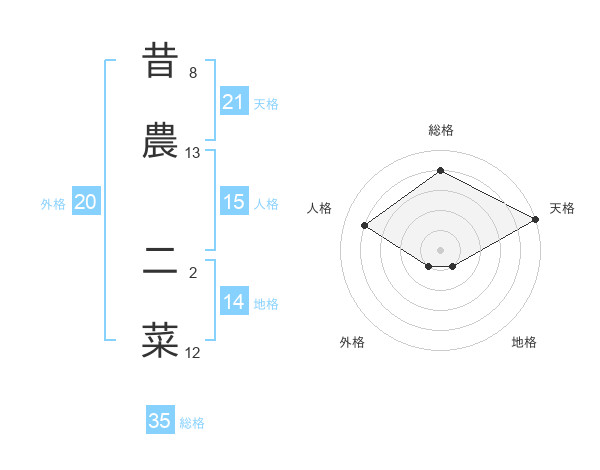 昔農 二菜さんを姓名の画数から五運を鑑定