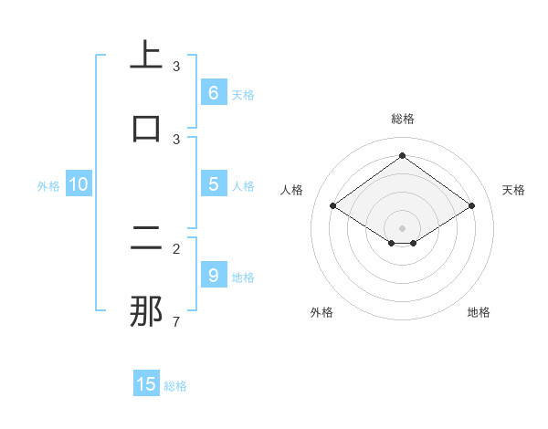上口 二那さんの総格は15画の4点!