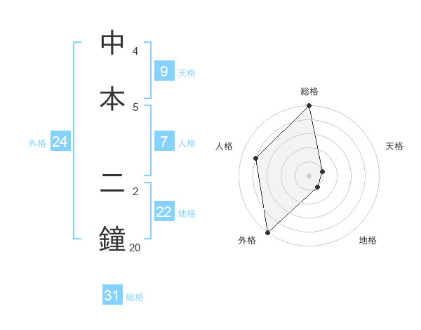 中本 二鐘さんの総格は31画の5点!