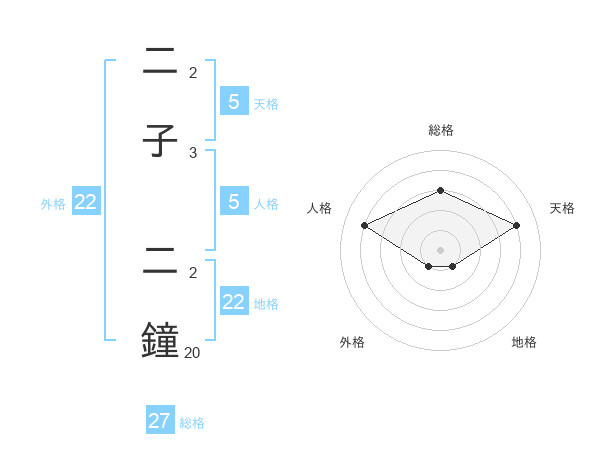 二子 二鐘さんの総格は27画の3点!