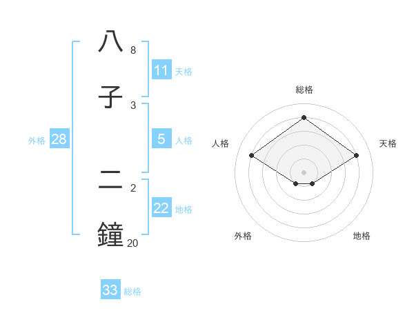八子 二鐘さんの総格は33画の4点!