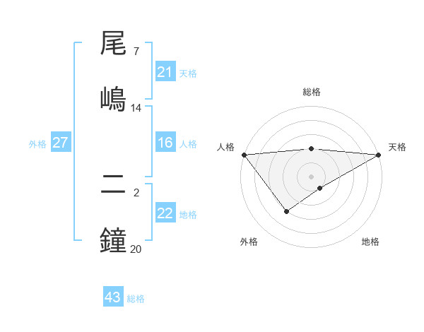 尾嶋 二鐘さんの天格は21画の5点!