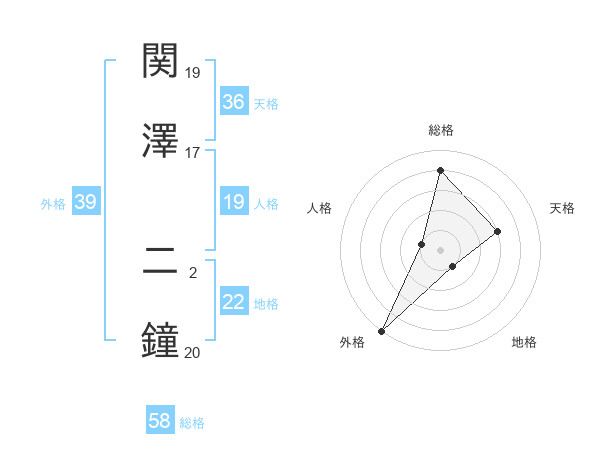 関澤 二鐘さんの総格は58画の4点!