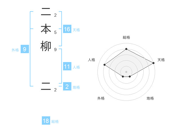 二本柳 二さんの天格は16画の5点!