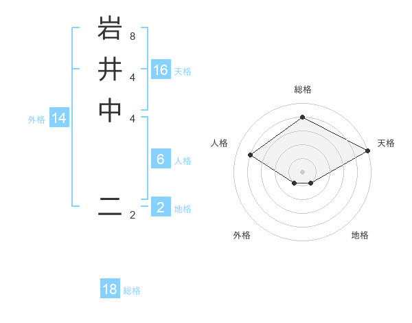 岩井中 二さんの天格は16画の5点!