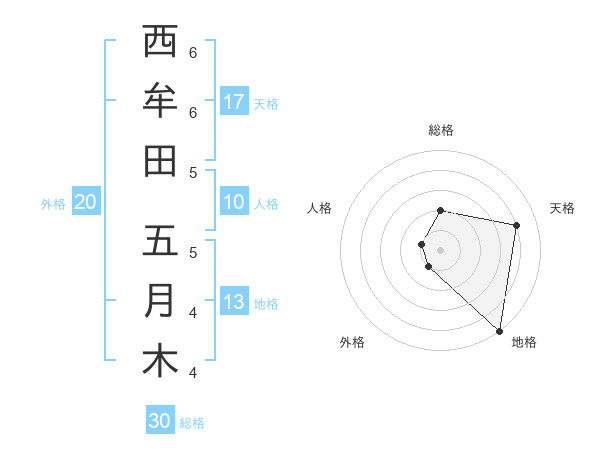 西牟田 五月木さんの総格は30画の2点!