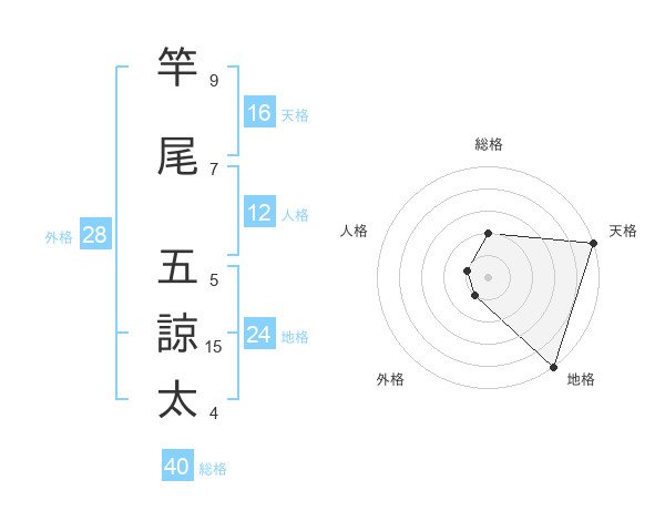 竿尾 五諒太さんの天格は16画の5点!