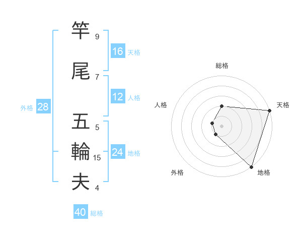 竿尾 五輪夫さんの総格は40画の2点!