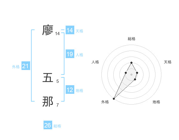 廖 五那さんの外格は21画の5点!