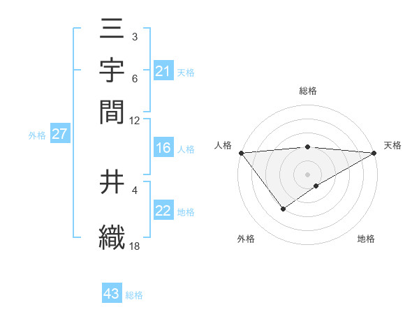 三宇間 井織さんの総格は43画の2点!