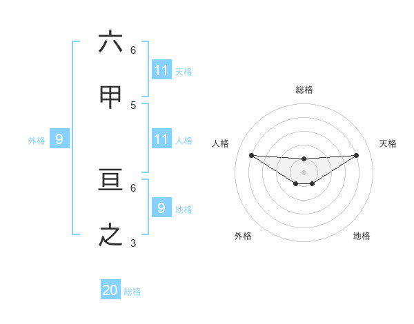六甲 亘之さんの総格は20画の1点!