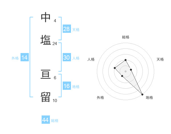 中塩 亘留さんの総格は44画の2点!