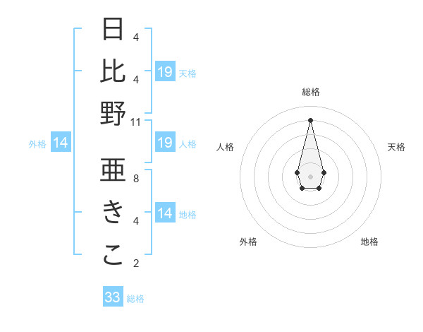 日比野 亜きこさんを姓名の画数から五運を鑑定