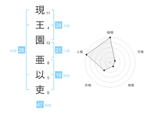 現王園 亜以吏さんの総格は47画の5点!
