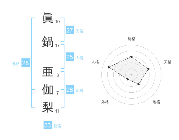 眞鍋 亜伽梨さんの総格は53画の3点!