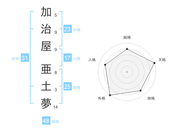 加治屋 亜土夢さんの天格は23画の5点!