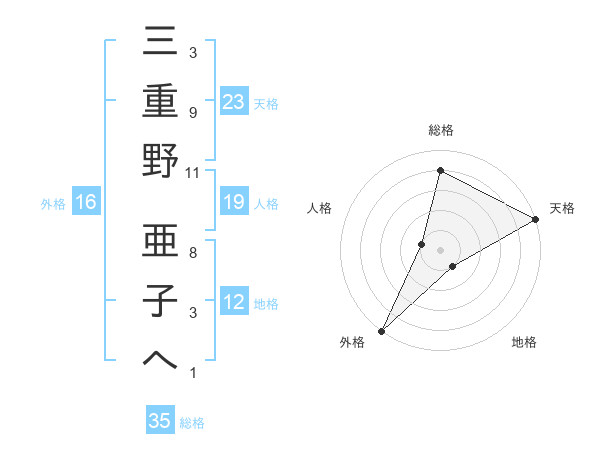 三重野 亜子へさんを姓名の画数から五運を鑑定