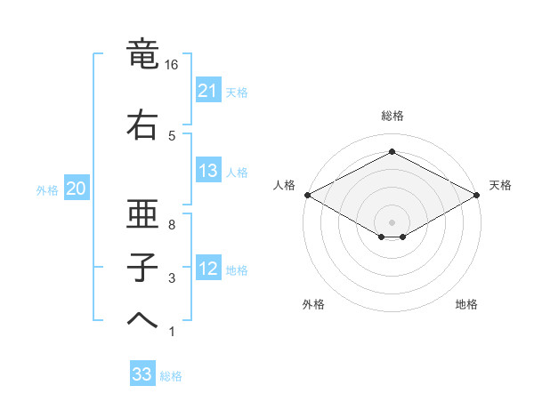 竜右 亜子へさんの天格は21画の5点!