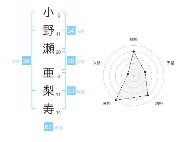 小野瀬 亜梨寿さんの総格は67画の4点!