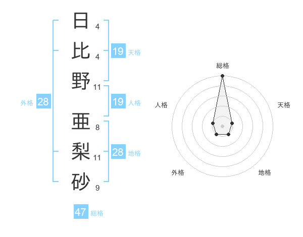 日比野 亜梨砂さんの総格は47画の5点