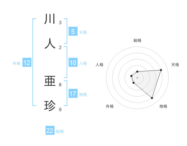 川人 亜珍さんの総格は22画の1点!
