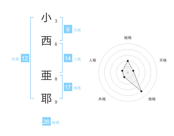 小西 亜耶さんの総格は26画の2点!