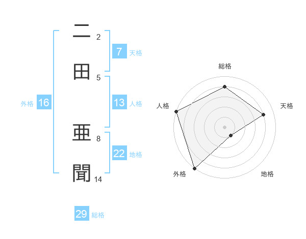 二田 亜聞さんの総格は29画の4点!