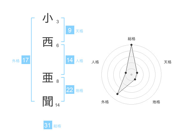 小西 亜聞さんの総格は31画の5点!