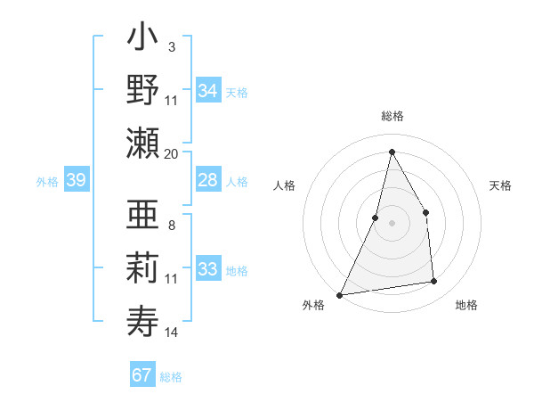 小野瀬 亜莉寿さんの総格は67画の4点!