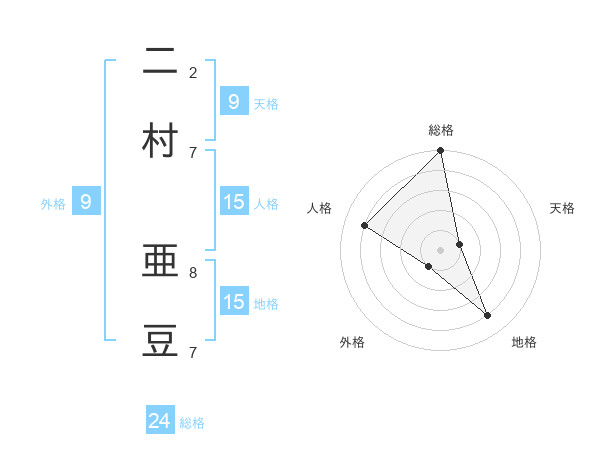 二村 亜豆さんの総格は24画の5点!