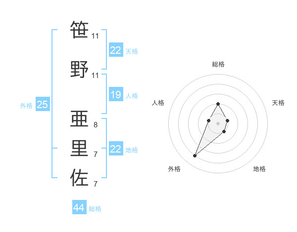 笹野 亜里佐さんの総格は44画の2点!