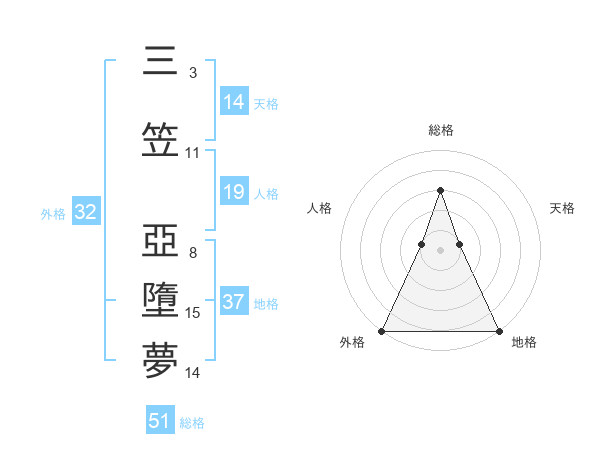 三笠 亞墮夢さんを姓名の画数から五運を鑑定