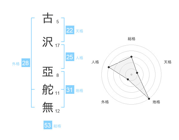 古沢 亞舵無さんを姓名の画数から五運を鑑定