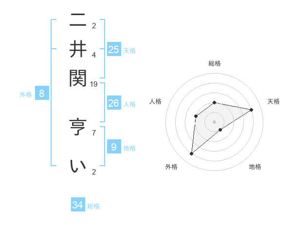 二井関 亨いさんを姓名の画数から五運を鑑定