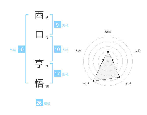 西口 亨悟さんの総格は26画の2点!