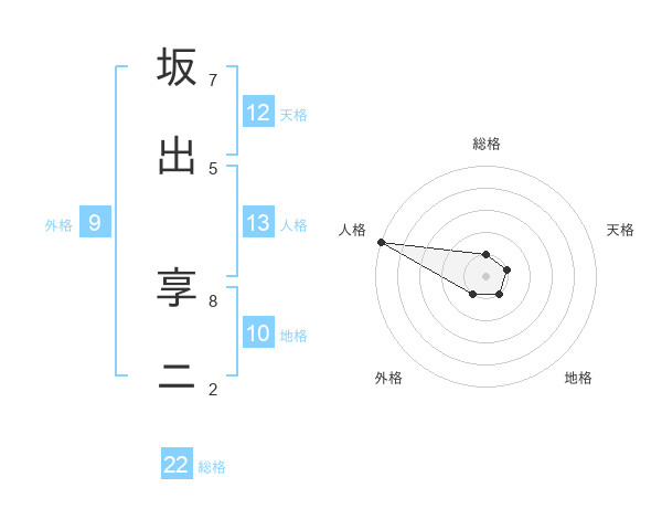坂出 享ニさんの総格は22画の1点!