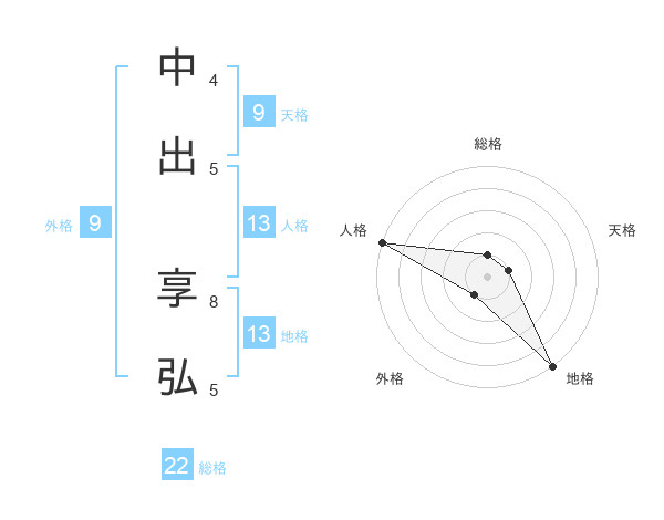 中出 享弘さんの総格は22画の1点!
