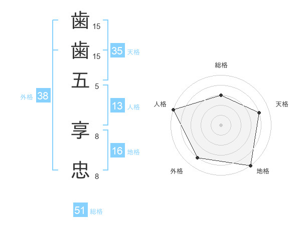 歯歯五 享忠さんの総格は51画の3点!