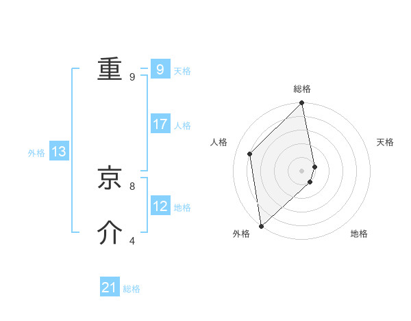 重 京介さんの総格は21画の5点!