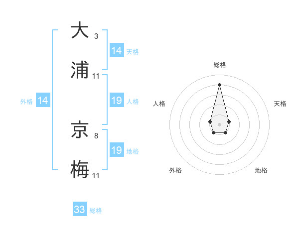 大浦 京梅さんの総格は33画の4点!